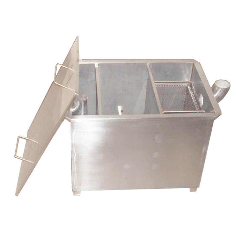 隔油池主要由兩槽'三槽'四槽分別組成,當(dāng)廚房排水流到第一槽時,雜物框?qū)⑵渲械墓腆w雜物(菜葉等)截流除去,進入第二槽后,利用油水密度差使油水分離。廢水沿第二槽隔油板向下流動,進入第三槽后從物理裝置凈化流出,再經(jīng)出水管收集排出。第二槽中的油珠顆粒物沿隔油板集聚向上漂浮流動,始終浮在隔油池的第二槽內(nèi),經(jīng)過隔油處理的廢水則溢流入排水渠排出池外,進行后續(xù)處理,以去除乳化油及其他污染物。